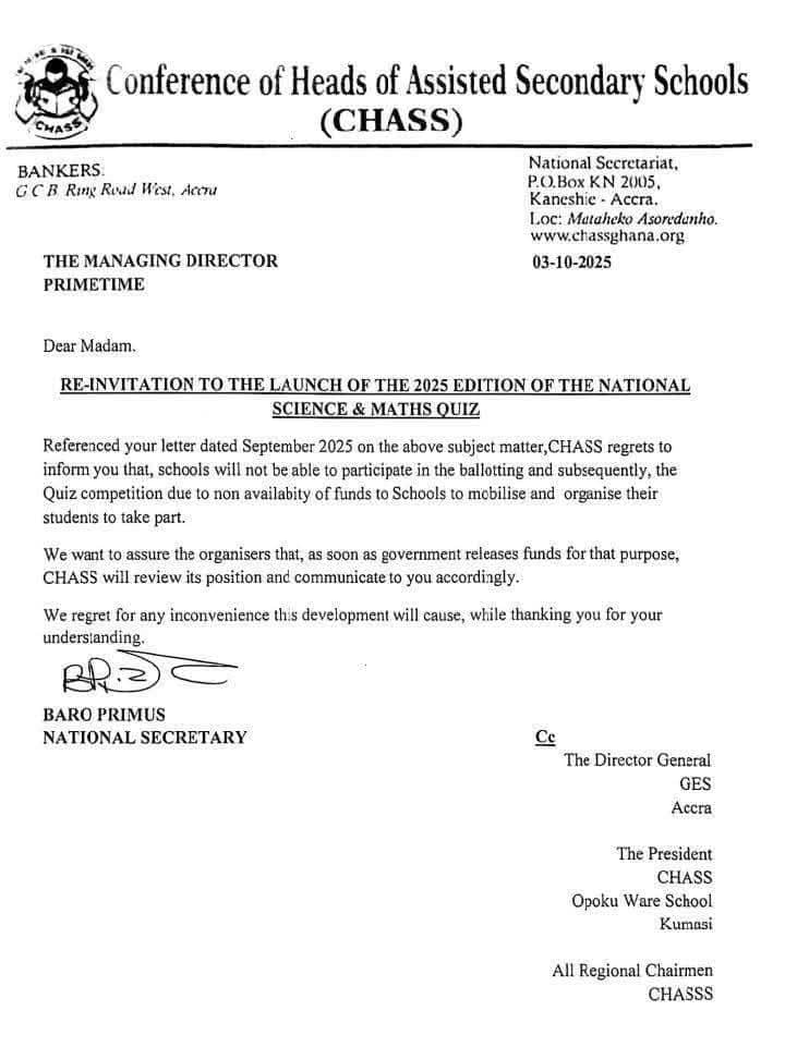 In a letter dated October 3, 2025, and addressed to the Managing Director of Primetime Limited — the organisers of the NSMQ — CHASS expressed deep regret over the inability of schools to take part in the upcoming competition.